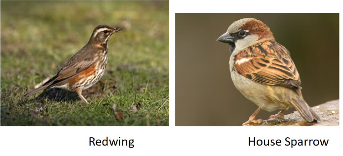 This year's top birds were Redwing, a Winter migrant from Northern Europe and Siberia, and last years top bird the House Sparrow with six of each seen.